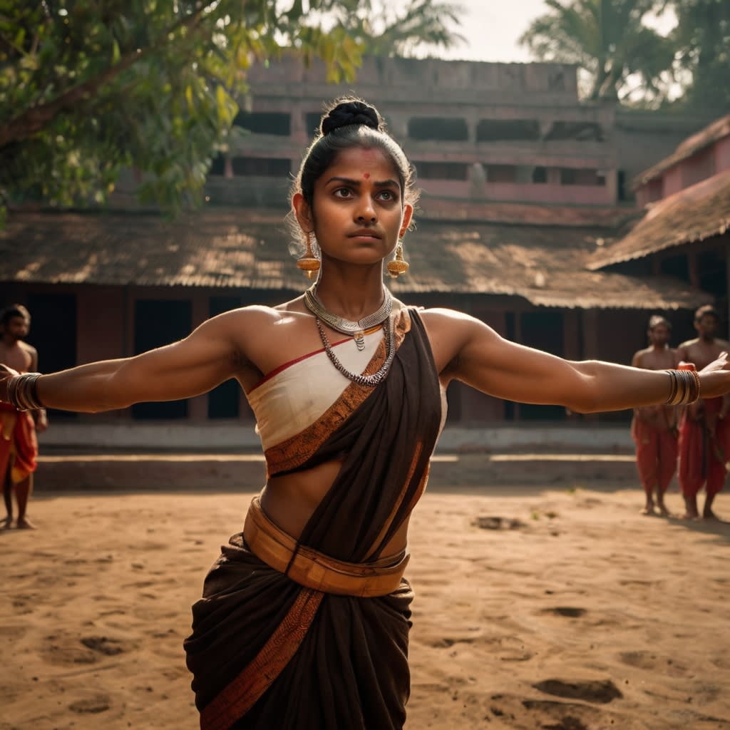 The next morning, Kavitha arrived at the training hall before the sun had fully risen. The air was cool and crisp, the scent of damp earth rising from the packed dirt floor. Guruji was already there, putting his other students through their paces.