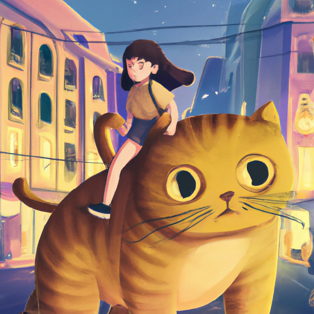 Luna was a small child who formerly resided in the thriving city of Lumina. She'd always been captivated by the magic of tale and adventure, frequently escaping into the worlds of books and films. A famous cat by the name of Whiskermaul thought to be as big as a skyscraper and with fur that shone like the stars in the night sky, was mentioned in an old book that she came upon one day while perusing an abandoned library. The book said that whoever tamed the cat would be given the opportunity to go on a once-in-a-lifetime cinematic excursion. As she embarked on a risky expedition to locate Whiskermaul, Luna's heart beat rapidly with anticipation and wonder.