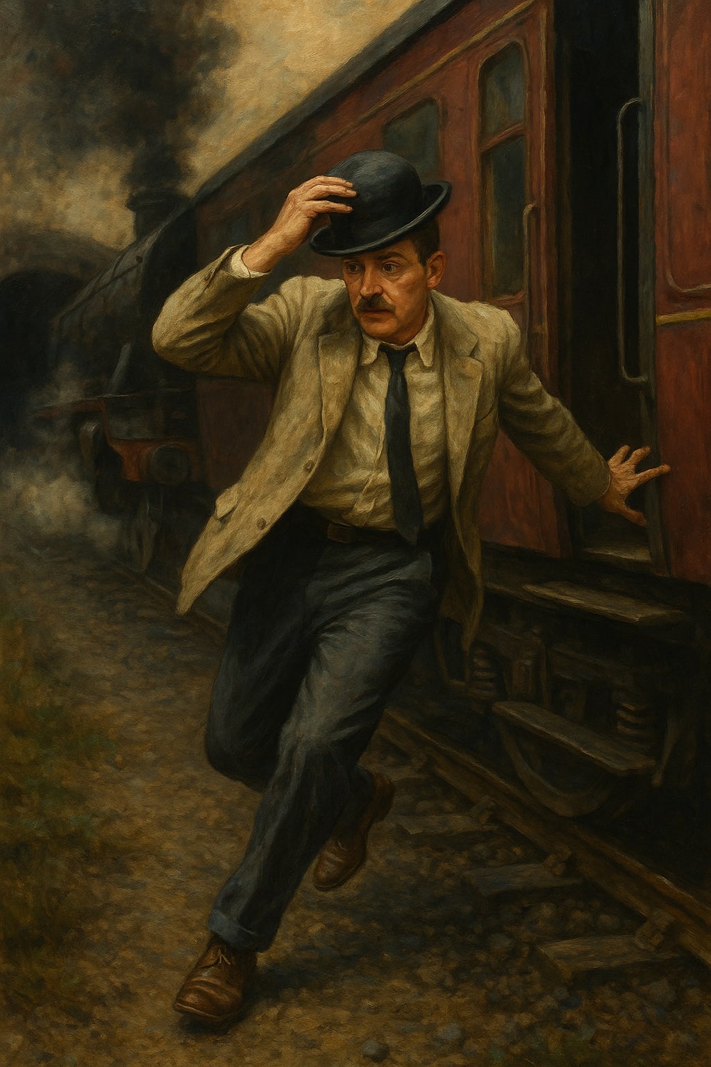 He jumped—not gracefully, his shoes more accustomed to lino than ballast—but with the sort of determination that used to get him three laughs a minute back when laughs were priced in shillings. The tunnel mouth yawned twenty yards behind, black as last night’s blackout curtains, and somewhere inside that artificial night lay his bowler: the crown scuffed, the ribbon defiantly tidy, the one thing in his life that still knew how to keep its shape.