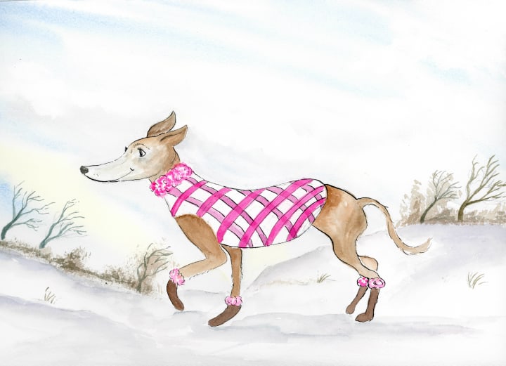 “Look! There is my friend Daisy!” cried Ewing. Peppermint Pappy saw a stylish dog dressed for winter as they ran closer.