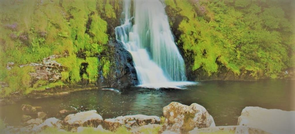 “You seem in no mood to talk friend, I shall leave you in peace” said the unknown voice. Edward had his head down, and didn’t see the water rippling as something swam back downstream at some speed. Edward lifted his head only to see the water settled again. He took a bottle of Mountain Spring from his bag and hastily gulped the contents. He rested by the water’s edge and observed the waterfall with wonder in his eyes. He found it peaceful here, with the water softly bubbling over the rocks toward the tranquil basin; a gentle breeze brought him some relief from the heat of the sun as he lay, enjoying nature’s beauty. Green hills glistened under the shimmering haze, contrasting the blue of the sky with the soft white wispy clouds dotted about. After a relaxing hour he gathered his things and made tracks back toward his campsite for the night, with a contented smile on his face, having found somewhere he felt very much at home.