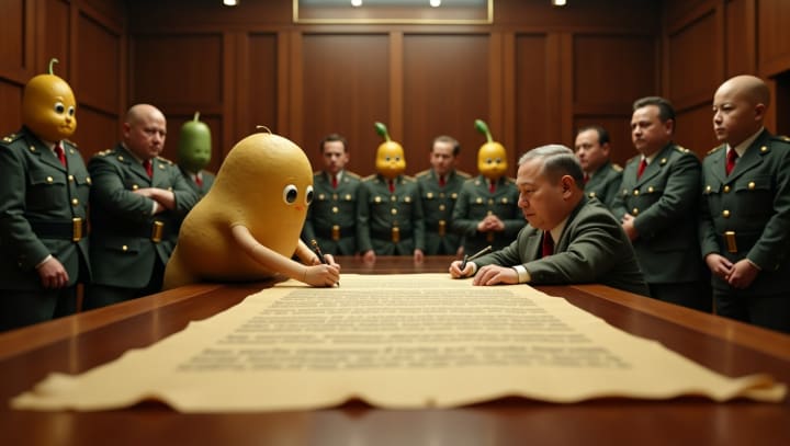 After months of warfare, both sides suffered immense losses. As vegetables wilted and fruits were crushed, General Spud and human leaders agreed it was time for dialogue.