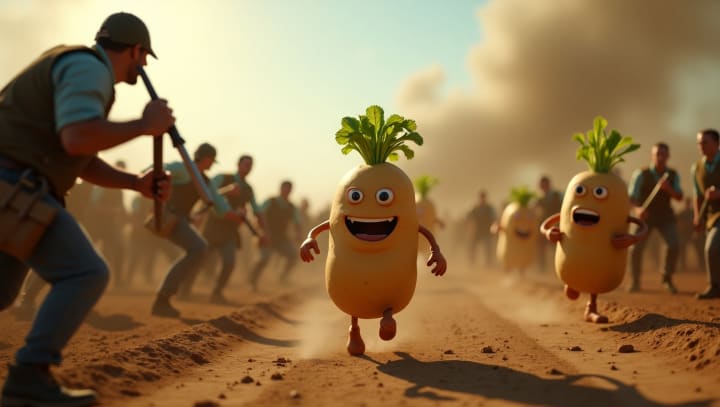 That very night, General Spud connected to the lab's mainframe and sent signals worldwide to underground vegetables. Carrots, spinach, broccoli, peas—all began to awaken, uniting in a single voice: "We demand freedom!"