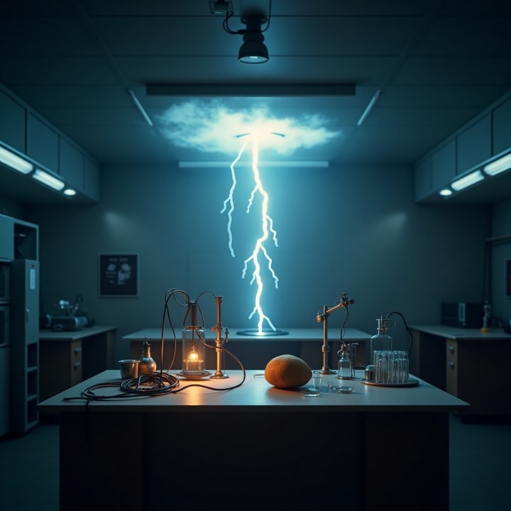 One stormy night, as thunder roared and lightning flashed, Dr. Tuber connected a batch of potatoes to electrodes, preparing for the final phase of his experiment. Suddenly, a blinding lightning bolt struck the lab's roof, sending a surge of electricity through the entire facility. Machines jolted, and the potatoes began to glow with an eerie green light.