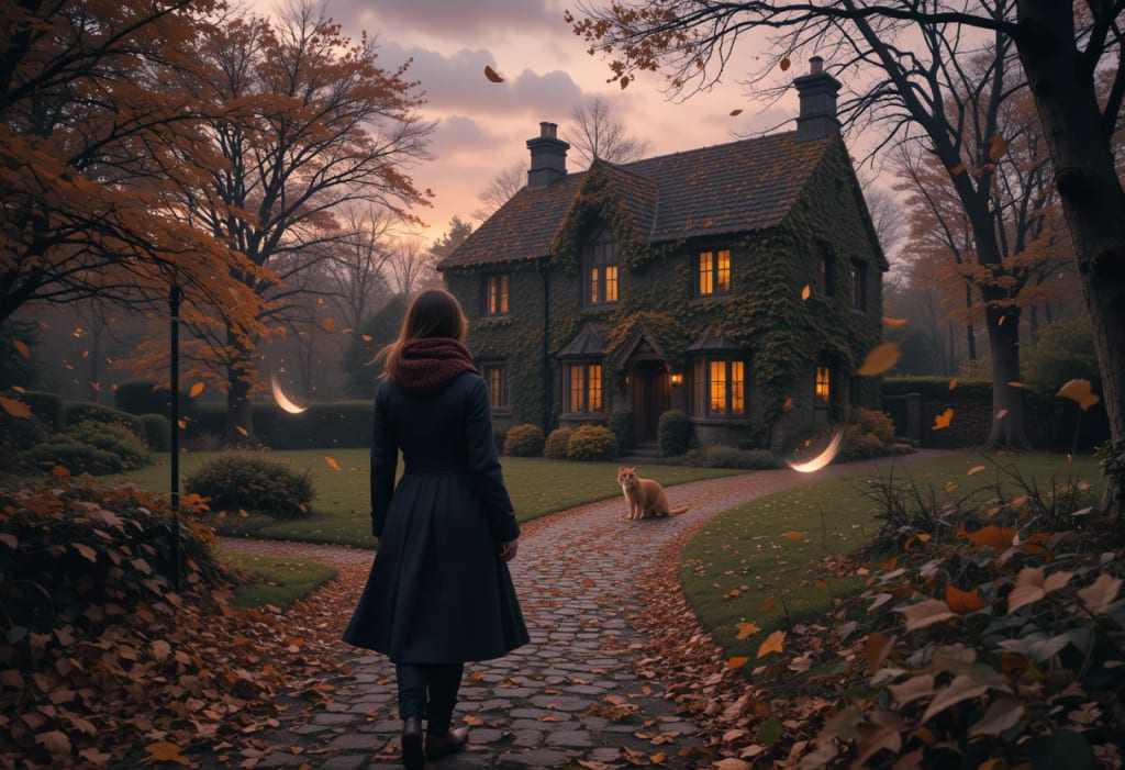 A woman (from behind) stands quietly in front of an old cottage. Autumn leaves swirl around her feet. The house looks peaceful but magical.