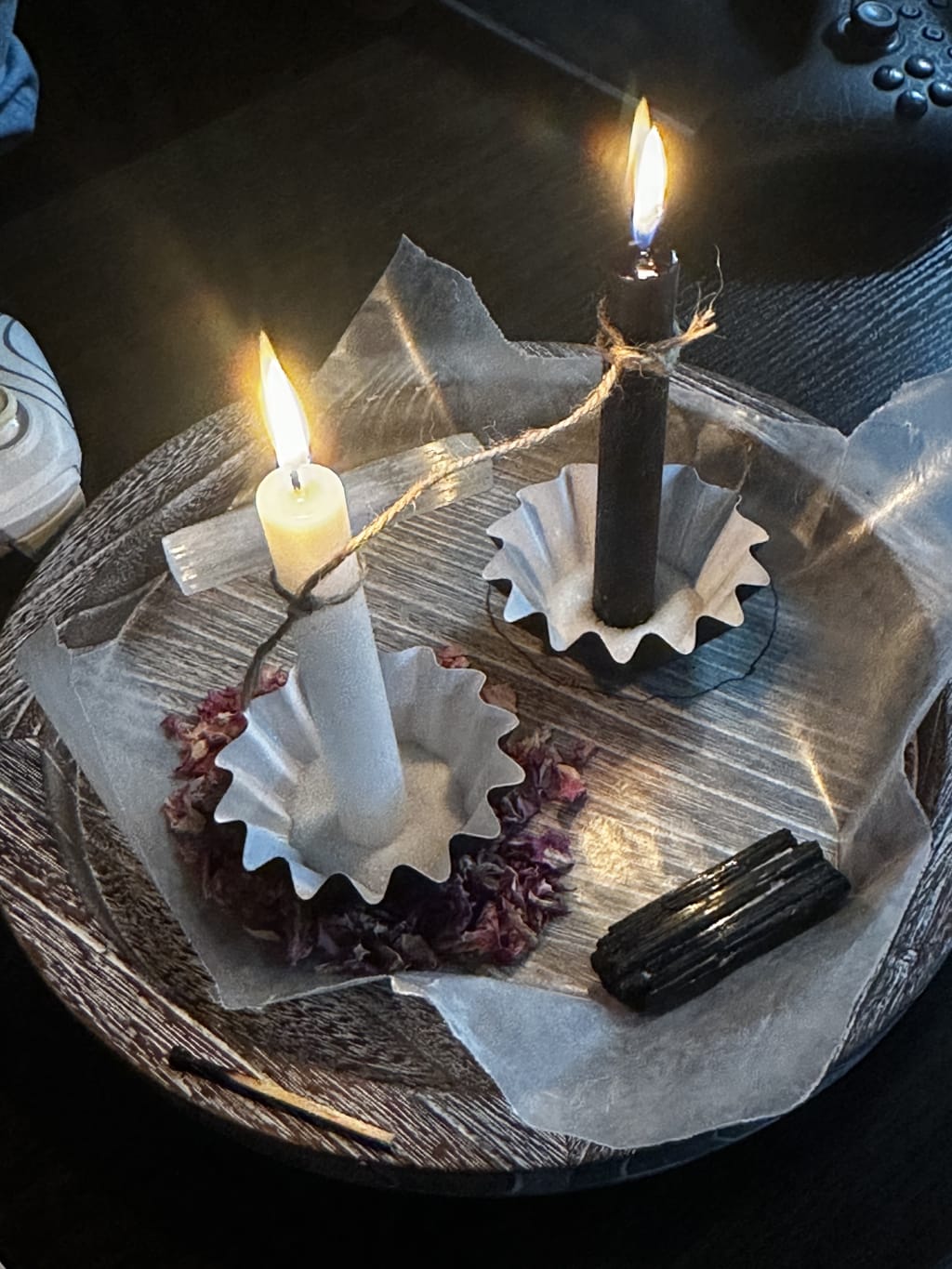 On my wooden altar plate, I placed the circle of rose petals for healing and bringing in positivity and love towards my candle and psyche. I placed a black circle around your candle to help absorb your toxic energy. Beneath both candles was salt to draw out the negative energy, for protection, and to intensify the actions I was going to invoke.