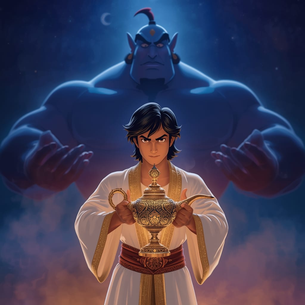 Hopeless, Aladdin rubbed his hands in despair, and by chance his fingers brushed against the lamp. Suddenly, smoke filled the cave, and from it rose a towering Genie with eyes like fire and a voice like thunder.