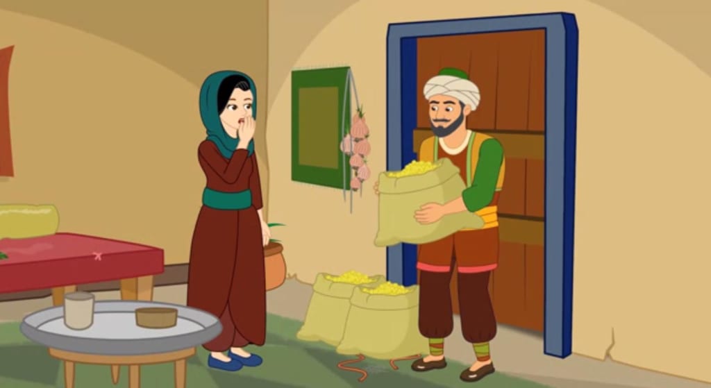 Her husband, "Ali Baba" agreed with her, but he suggested to her that they weigh the gold before burying it, so she told him that she would go to his brother's house, "Qasim" next door to them and borrow the scales from his wife.