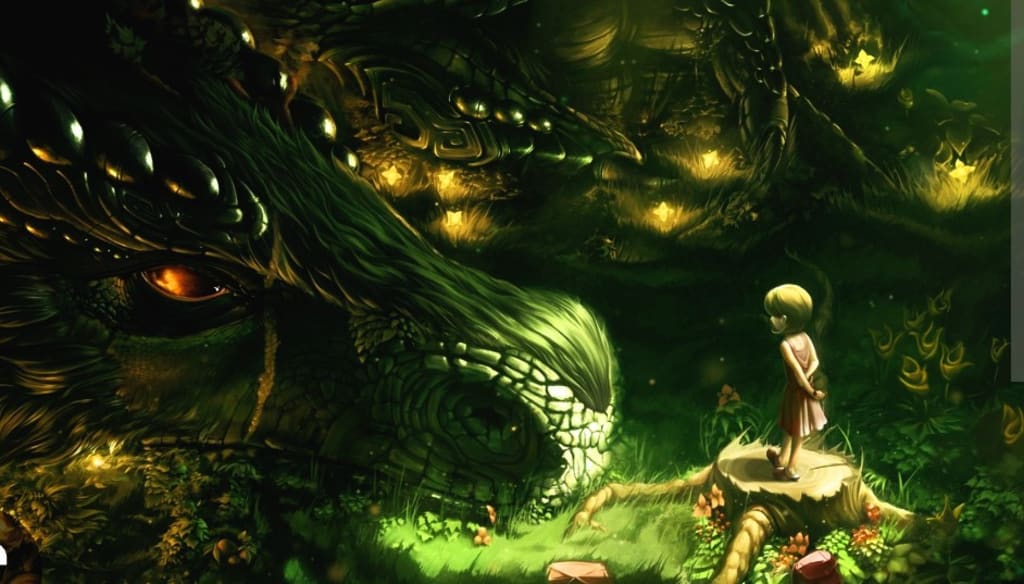 Her smile never leaves her childish face. Saya's eyes are wide with wonder as she plays with the twinkling lights on the cave wall. A low snore erupts behind her and she flinches for a moment only to turn her gaze into the massive circular room where life flourishes. The sound of water flows into it with grassy ferns and tree stumps but in the center she sees a green dragon sleeping on a mound of treasure reflecting the sunlight from above the cracked earth to where she stands. The dragon's long slender face is a scaley dark greyish green but along it's snout all the way down his back and tail is a moss colored fur covering its scales. She wispers, "Dragon." Her little voice echoes throughout the cave. The dragon's eyes open with a piercing orange gaze and Saya shrieks and ducks behind a boulder.