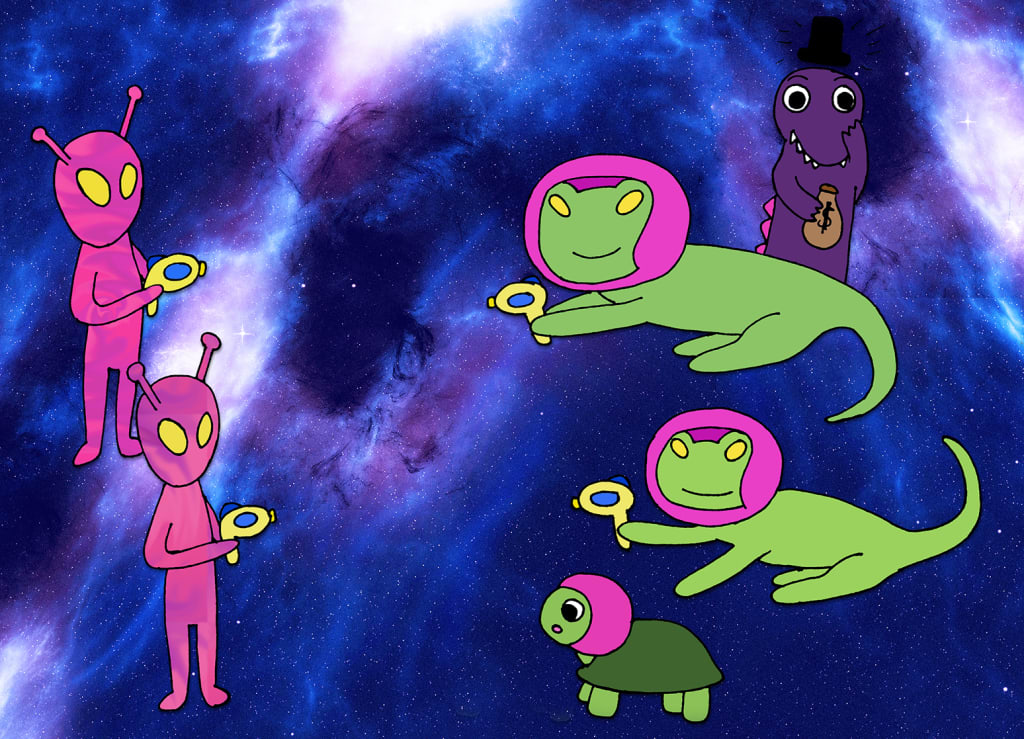They arrived on the scene to find Bank Planet no more. They noticed a group of pinky-purple aliens—their skin almost resembled a swirly tie dye effect, making it quite beautiful if the trio of astonauts were being honest—amidst the vast piles of Ned’s fortune. One of them seemed to be frolicking in the money. It was certainly quite an unusual sight.