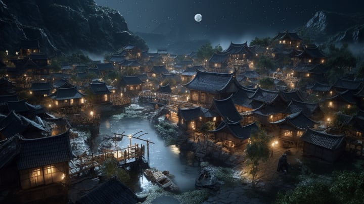 In a time long past, when the moon ruled the night and lanterns held stories of old, there stood a village where a grand pool was the centerpiece, and a valiant horse was the hero.