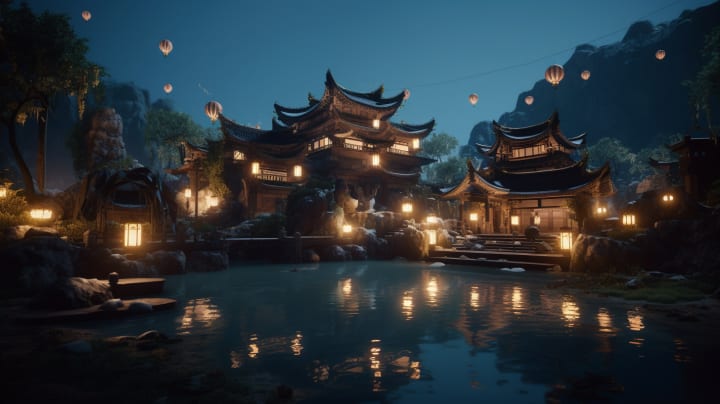 At the heart of the village was the magical Pool of Mirrors. Legend had it that the pool could reveal the future during the full moon when its glow reflected off the water. Surrounding the pool were lanterns that would be lit each night, their light dancing in harmony with the shimmering stars.