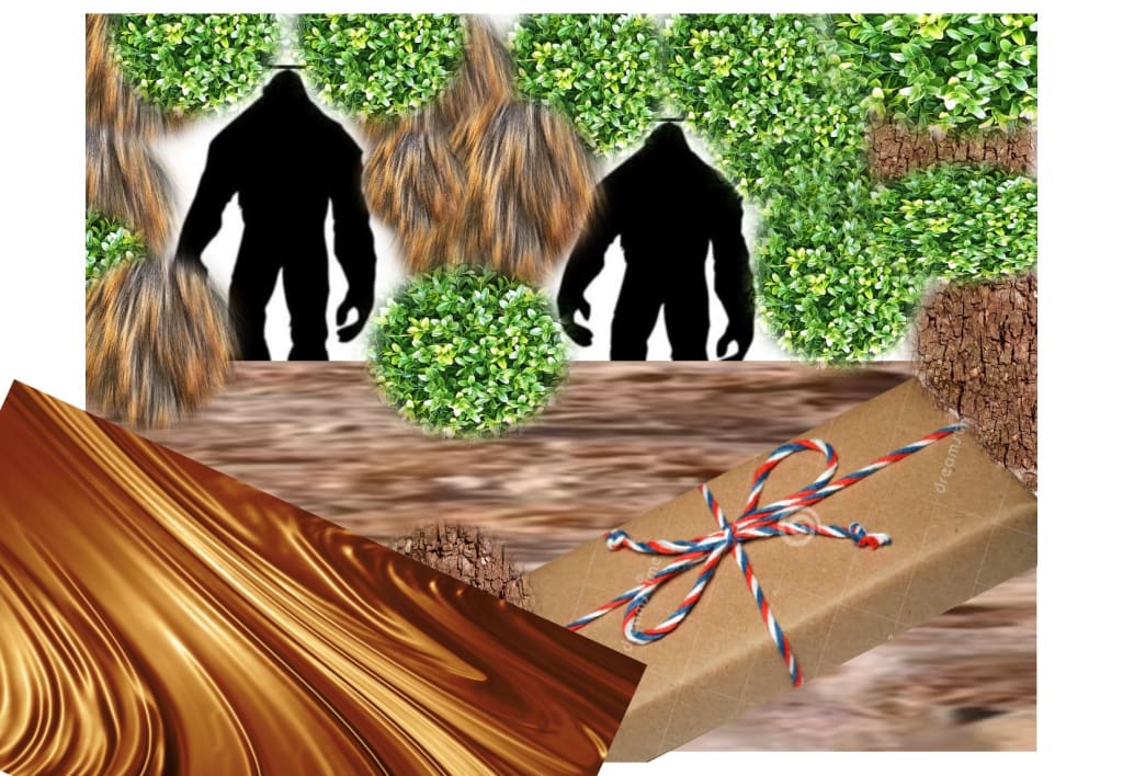 “Seriously you two what are you arguing about”! I ask. Big Foot stomps his foot with shoe on and his father stomps his bare foot. Simultaneously they yell “he wants to wear shoes/ he doesn’t want me to wear shoes.” I stared at them blinked several times and said, “and for that I almost drowned in a chocolate river”. Slammed the door, walked over flopped on the couch. And closed my eyes. I reached out for a blanket. As I did, I found a box wrapped in brown paper. I pulled the box towards me. It did not seem to have any markings on it or anything else. It has been such a strange day I did not care. I opened the brown paper and the box and inside I found “CHOCOLATE”!!! Oh, no! I thought I never wanted to see chocolate again. Turns out I’m so hungry I don’t care, and I eat the chocolate before finally falling asleep to get the well-deserved sleep.