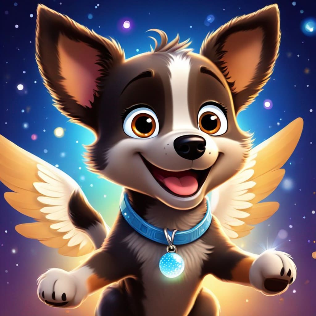 a smiling six year old, female, Blue Heeler dog, brown fur, excited expression, following a tiny, shimmering ball with wings and sparkling light.