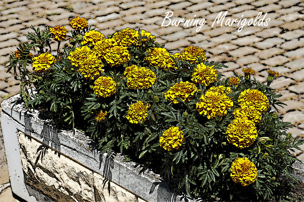 “Get down,” I ordered softly. When we were laying in the leaves, we were peering through the branches of a bush at the burning marigolds.