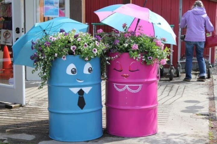 Olivia cleared the wooden two by fours and bricks that were lying on the ground between the shed and the garage. She rolled a large storage drum to the area right between the two. She then filled it with two large bags of potting soil.