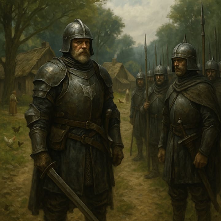Behind him, thirty men stood in disciplined formation — armor dulled with ash and pine soot, helms low, eyes sharp beneath their visors. Each carried the mark of Gindrath: a silver fox stamped upon leather cuirasses or burned into the shaft of a spear. These were not soft garrison men — they were woods-hardened, veterans of mountain border raids and famine wars, men who could kill in silence and vanish just as swiftly. Even now, they breathed in unison, boots rooted in the earth like iron-grown trees.