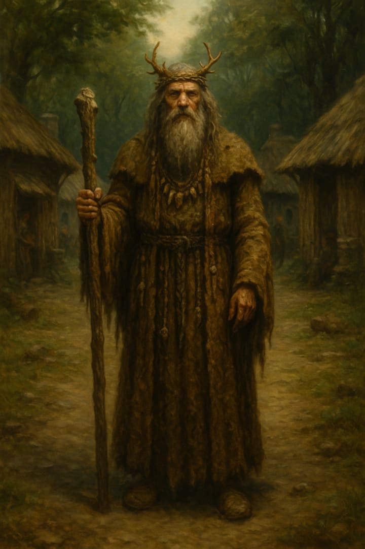 He stood tall, not imposing but anchored, wrapped in bark-dyed wool and moss-threaded robes. His skin was the color of old soil and granite, lined and weathered with age and knowing. A heavy staff, gnarled and partially petrified, rested in one hand — its surface etched with spirals and bone runes that caught the light like water glinting from a cave mouth. His beard was thick, streaked with ash-grey, braided with tiny bones and dried herbs. A crown of small antlers circled his brow, woven with thorn and feather.