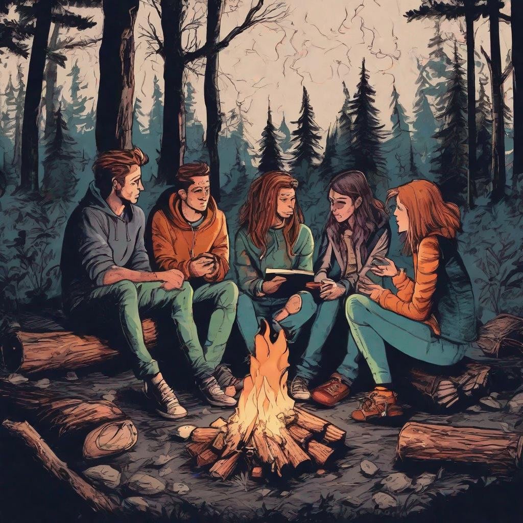 John, the ever-serious one of the group, sat with Brenda, his girlfriend, on the outskirts of the circle. They stole glances at each other, the comfortable silence between them speaking volumes. John noticed the flames cast an unsettling orange glow on Brenda's face. "You okay, Bee?" he asked, a furrow appearing on his brow.