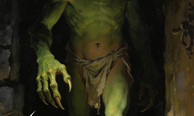 Reed instinctively tried to speak, but his voice came out as a shrill, raspy croak. He reached out in shock—a green hand with only three fingers and sharp, yellowed claws met his gaze.