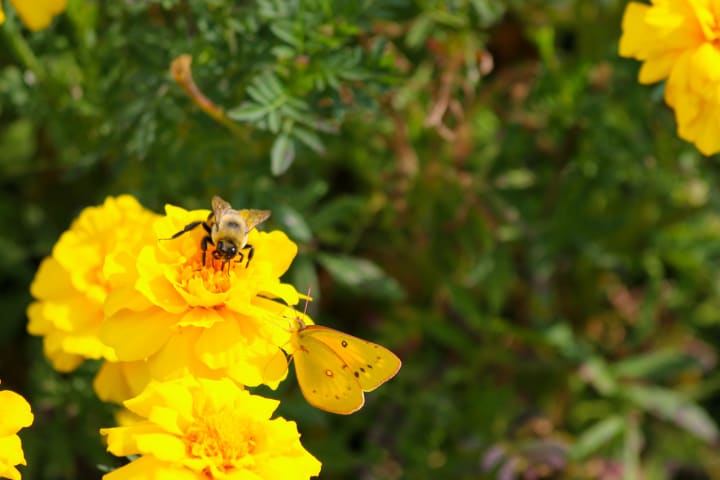 Yellow. Yellow sun and its warmth on your face; marigolds bobbing in the breeze; yellow-striped bees sucking nectar from a blossom; golden blooms of wattle in spring; and warm sand between your toes as you run along the beach.