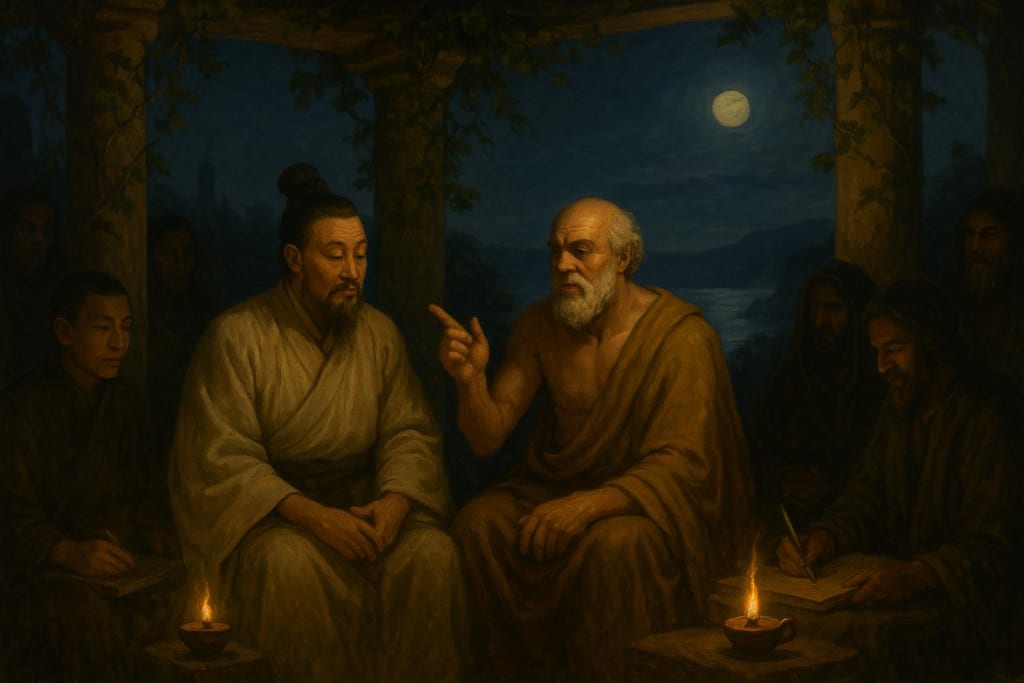 Beneath a pergola of stone entwined with ivy, in the flickering light of a few oil lamps, Confucius and Socrates sat side by side.