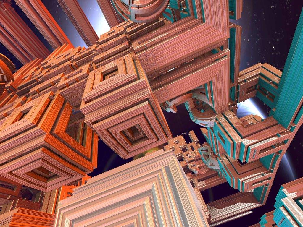Therewith a galactic general public beheld colossal sky-shapes completing the process of blending and merging and taking possession of the jagged hills and steeply plunging valleys which had hitherto been the sum of these Nereynaean tropics. Some otherworldly orchestral arrangement was apparently nearing crescendo, too glorious to have been a mere soundtrack inserted by the Grindoes, impossible as it was to determine whence it came otherwise. Joe and Neetra’s table meanwhile had come at rest atop a stone-flagged roof which by now existed, soaring on Olympian pillars hundreds of feet from the floor.