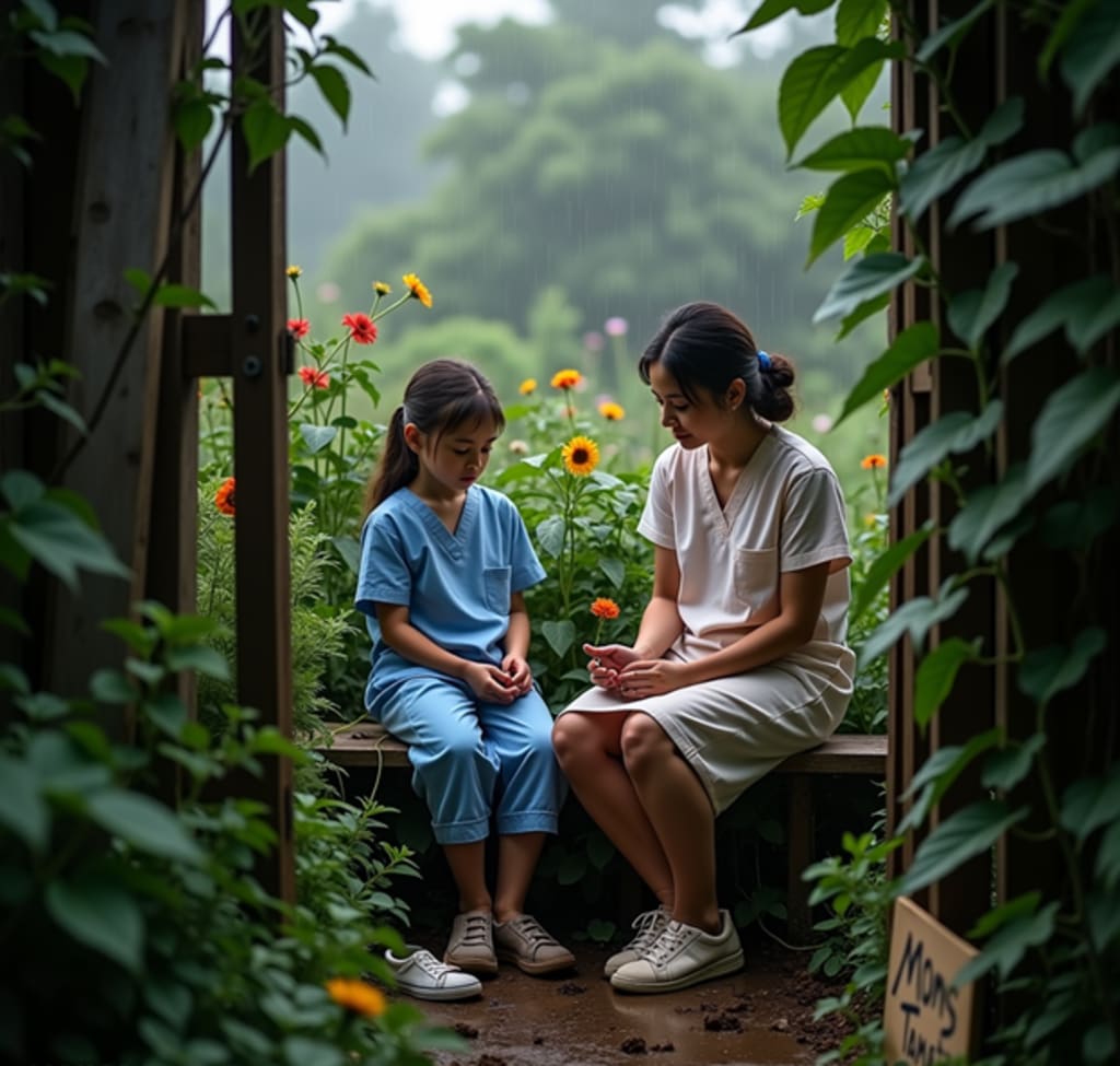 The rain starts, gentle at first. A young nurse in blue scrubs joins us, Clara's daughter Emma. She carries the weight of the night shift in the shadows under her eyes. Wordlessly, she sinks down beside her mother, their shoulders touching. They don't speak. They don't need to.