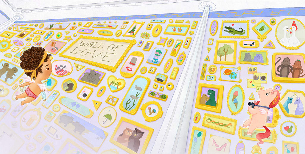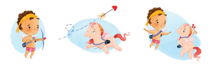 Second, she needed to plan out the pages. So she separated the words into chunks to see where they’d land. 32-pages plus cover equaled pure delight! She sketched rough thumbnails and arranged the pages, until she felt that she got it just right. Then it was time to meet her characters! Danette drew Cupid and his sidekick Pegasus over and over until they leapt off the page. They were ready to take action! Ready, set, let’s make the world a more loving place.