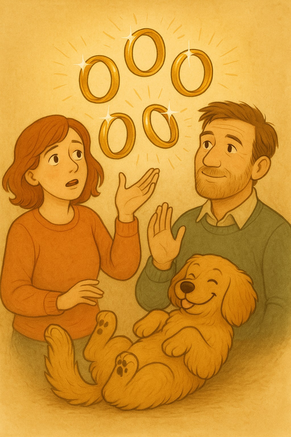 Five golden rings gleamed up — actual jewelry. No feathers, no claws, nothing he’d need to apologise for. Just warm, bright circles catching the light like tiny storybook moons.