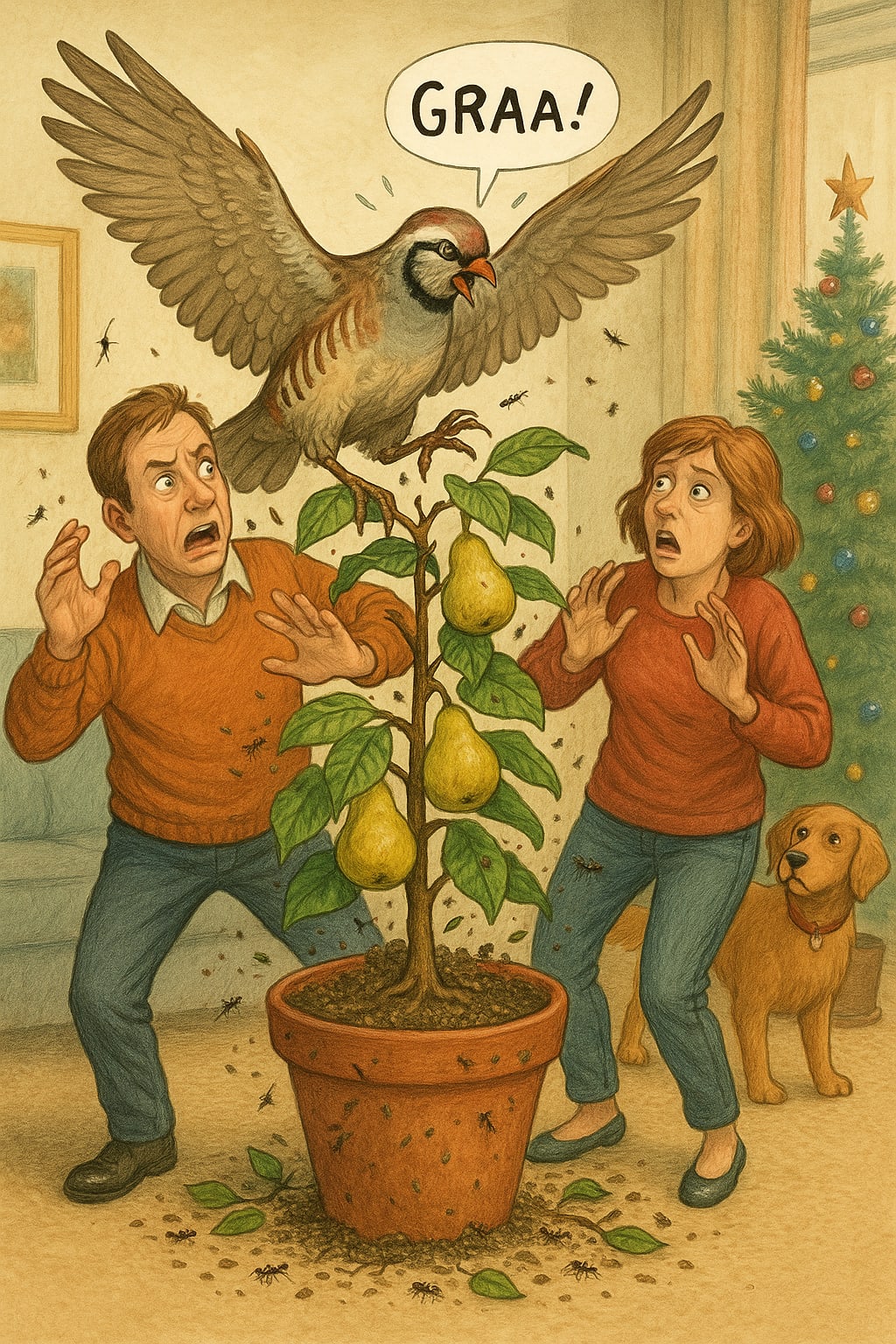 He lifted the lid. The partridge exploded into the room like a winged argument, all claw and feather and prehistoric shriek. Jane yelped and fell back onto her hands; Roo barked furiously from behind the sofa—officially logging the incident; the contractor ducked; the partridge made a hard left and perched in the pear tree, which quivered like a tuning fork. A ripe smell of damp soil rose, and with it—almost theatrical in its timing—a small, pale galaxy of aphids began to appear, turning the leaves from green to starred.
