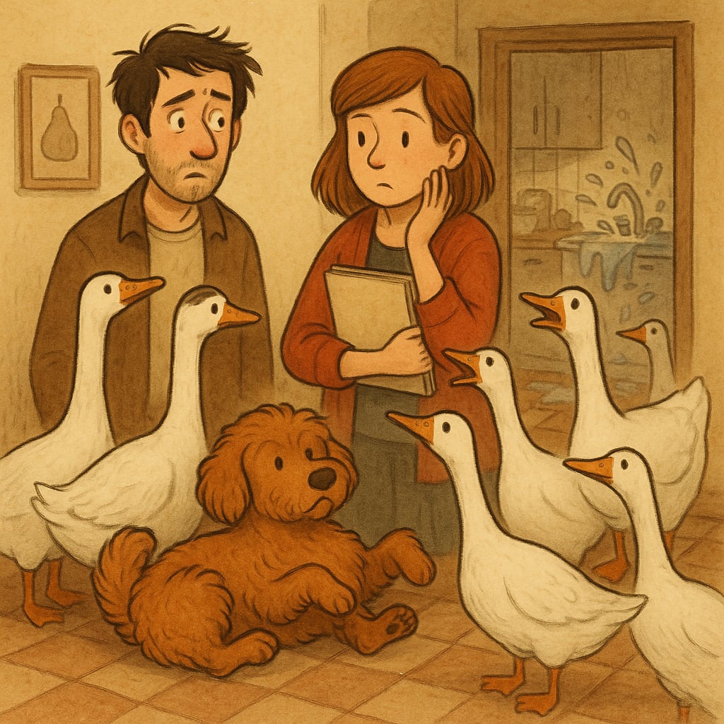 The geese had overtaken the kitchen in a soggy coup d’état. Water everywhere. Feathers drifting like regretful snow. They honked with the volume and emotional commitment of brass instruments possessed by malicious spirits.