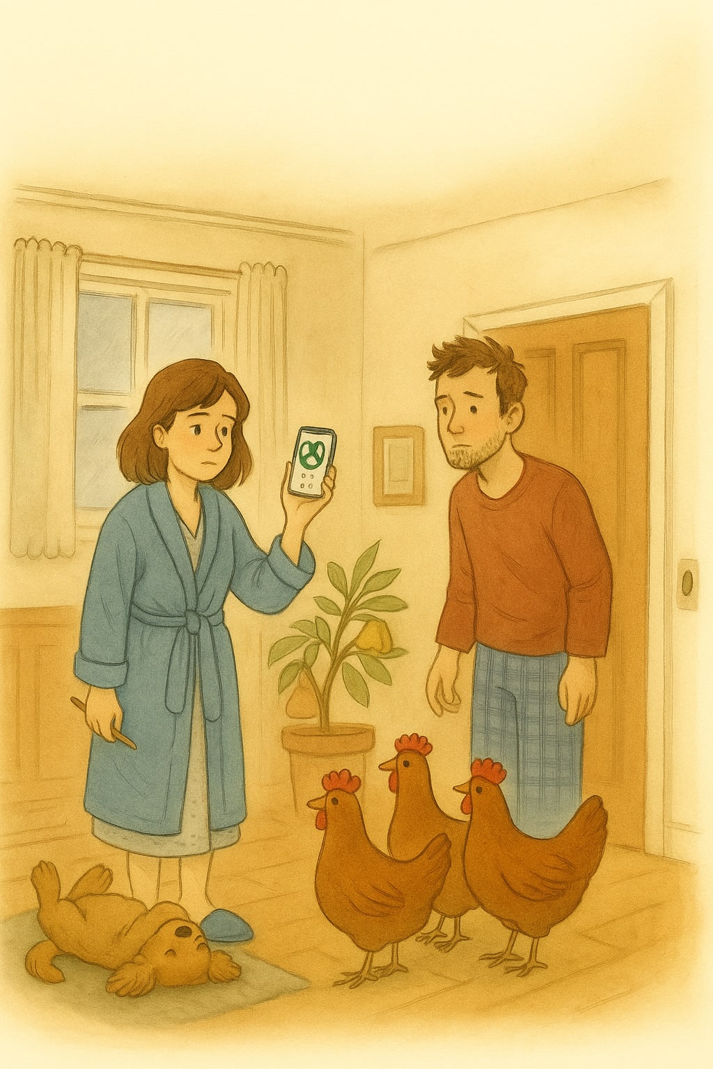 Stephen watched them, a peculiar ache expanding behind his ribs, the kind that felt like hope’s sibling. The bungalow was still ridiculous, the plan still doomed, the future still a spreadsheet with mysterious red cells. But Jane was here with a chicken in her lap, learning a sentence she didn’t need, and somehow the room felt less like a problem to solve and more like a place that held them both.
