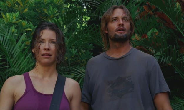 At the top, light filters through a covered hole in the ceiling. Sawyer pushes brush aside, letting sunlight stream in. He pulls himself up and out, then reaches a hand in to help me out.