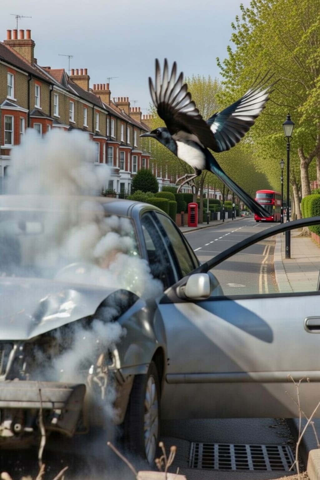 At the sound of screaming brakes Hugo flipped his gaze from the flying magpie to the careering car, and as it crunched into the bollard, he has let out a loud exclamation of:
