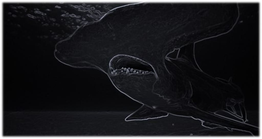 Cracking the glow stick Tony swam down the twenty feet to the eerie green glow just around the mouth of the cave. He looked out and waited, sure enough the huge shadow slid across the bow of the wreck. The monster was above him he retreated and swam back to Lindy.