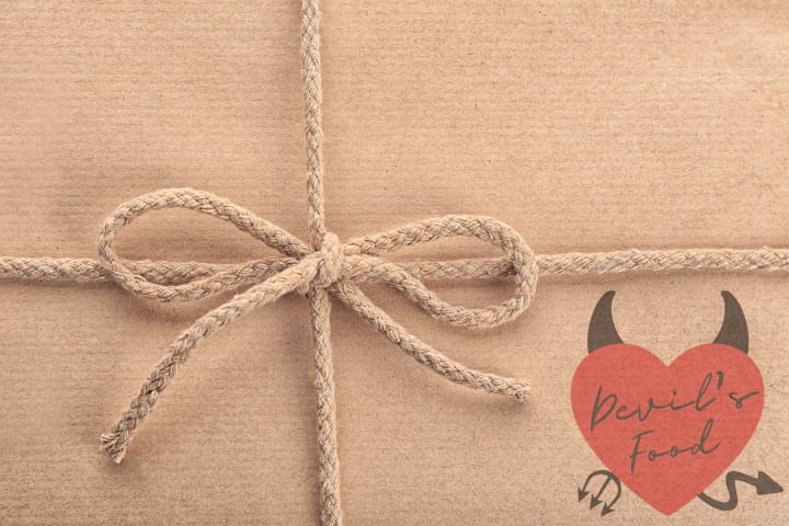 I opened the door, and sitting on the doorstep was the cutest package. The box was wrapped in brown paper and stamped with a logo that matched Dia Devil's famous tattoo-- a heart with devil horns, a tail, and a pitchfork. The only difference between the logo on the package, and the tattoo were the words Devil's Food. The package was tied up with a twine bow.