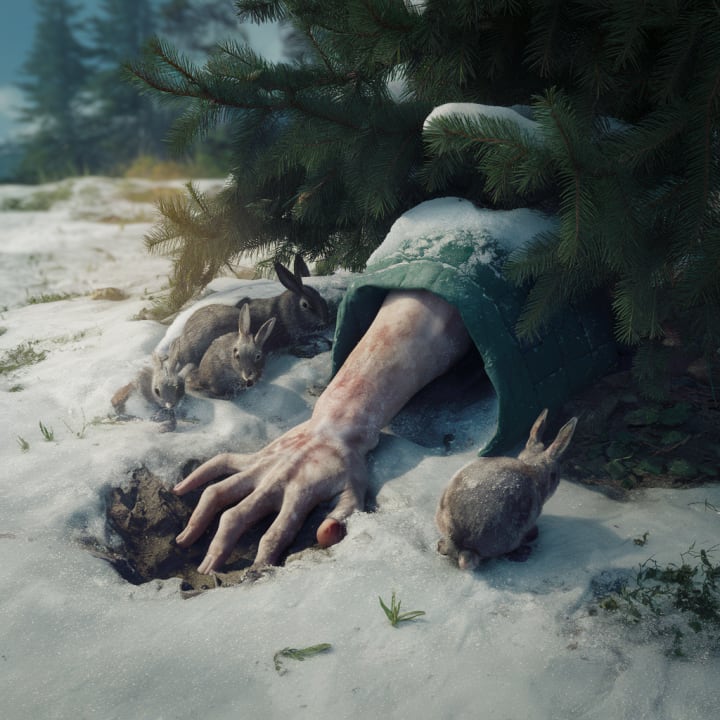 The wild rabbits began to dig deep under a pine tree. Slowly, a frozen, pale, stiff human hand emerged from its snowy grave.