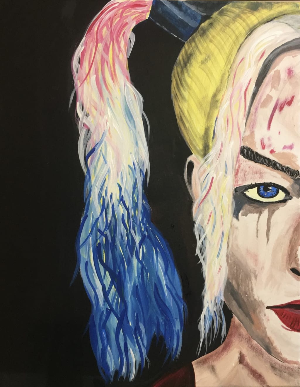 The building was dark except for small circles of light in a grid pattern on the floor cast from the low hanging lamps above. Harley couldn’t contain her joy at the sight of the space, she immediately embraced her inner gymnast and began running around performing summersaults and cartwheels. She found a ladder up against the wall and without stopping, ran up to the seventh rung then leapt out and swung from the closest light. In the center of the room was a desk and chair. Tim was chained to the chair, his hands and feet bound. He had duct tape covering his mouth. He was unconscious. Standing over him was a man wearing a fedora. Does he sincerely believe wearing that stupid fedora will help? Harley swung from light fixture to light fixtur while doing her best imitation of Tarzan’s howl. She reached down and grabbed the fedora from his head on her way to the next lamp.