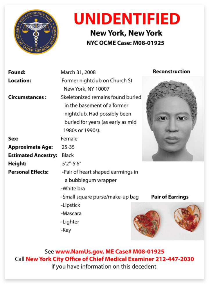 Myrtle's brother, Robert Brown, was watching "NBC Nightly News with Lester Holt" when it aired a profile of the cold case squad at the New York City Office of Chief Medical Examiner. Led by Dr. Angela Soler, Assistant Director of Forensic Anthropology, the team manages nearly 1,250 unidentified person cases. Dr. Soler has been finding evidence and determining if they can be tied to a loved one of 20+ years in age. Many of these cases are based on trace clues and even decades old circumstantial patterns that she can make sense of given.