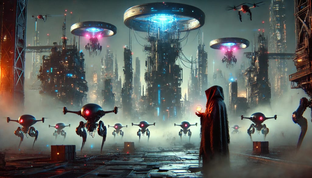As they approached the tower, the hum of Syndicate drones grew louder. The air crackled with static, and Lena’s pulse quickened.