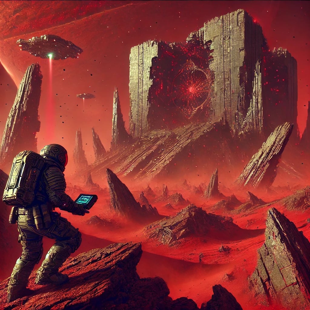 The planet’s surface stretched before him like an endless wasteland of twisted metal and jagged stone. Crimson sands danced in the air, stirred by an unseen force that hummed just below the threshold of hearing. The distress beacon he’d activated during the crash was his only hope, but he couldn’t afford to wait. Not when the air itself felt hostile.