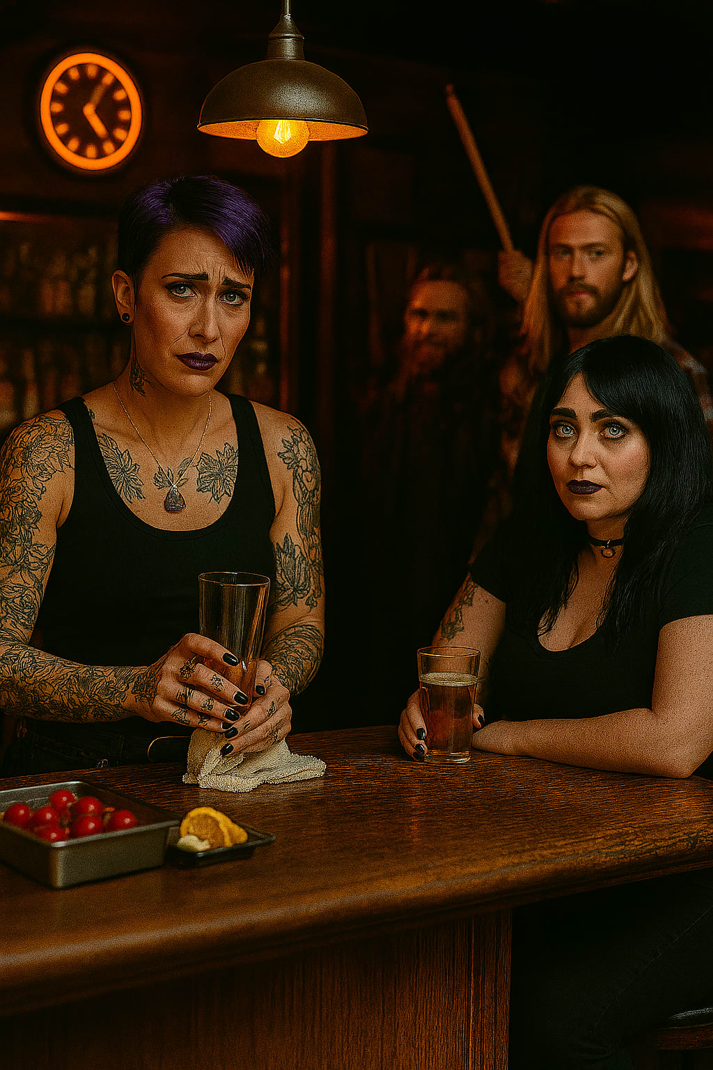 He slides behind the bar with the casual entitlement of a regular who’s outlasted three bartenders and at least as many health inspections. His arms wrap around Shelly’s waist from behind, and he lifts her half a foot off the ground. “Best view in the house,” he declares, burying his chin in her purple hair. The leather of his jacket creaks, cold and slick against her bare forearms.