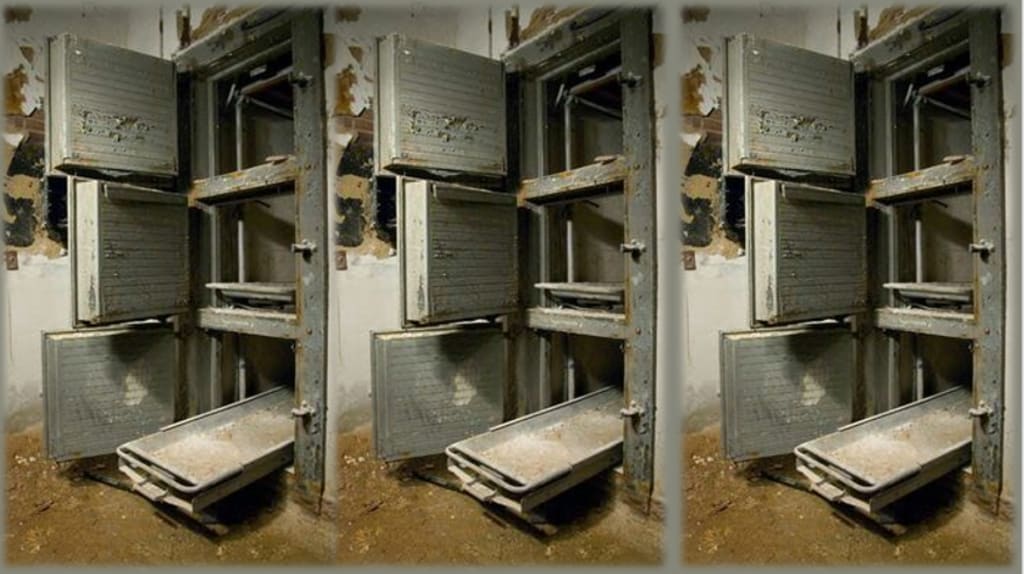 Several minutes earlier, English had opened the iron gate successfully, exposing the dark tunnel beyond it, and that was when he first heard the distant voices and footsteps coming toward the end of the hallway in the basement above him. At first, he stood frozen, but he quickly realized he would be seriously punished if he was found in the subbasement. He looked around frantically for a place to hide, but the only place that wouldn’t require him to crush his body underneath a huge mass of wooden pallets was in the tunnel. English stared into the tunnel briefly before abandoning this idea; he had no idea how far back it went or whether the men coming downstairs had flashlights that would easily expose him. He ran toward the stairs as the voices grew closer, and then he turned and went into the morgue. There is a saying that extreme situations call for extreme measures; English recalled this as he made his decision and began to push his body into one of the nine drawers that made up the back wall of the room. He sealed the door behind him just as the footsteps reached the base of the stairs.