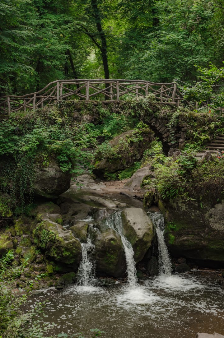 As you make your way to the bridge you realize it goes over a man-made pond with water lilies floating everywhere, a frog hops from one lily to the next as a hummingbird hovers next to a lily. Dozens of six feet high cattails surround the waters edge, with their slender leaves standing straight up next to their brown corn dog shaped flowers. A line of yellow honey suckle bush, flowers peak through each cattail, making it mimic a water painting. Jordan walks closer to the huge rock noticing how much work it must have taken to not carve but chisel each step into it.