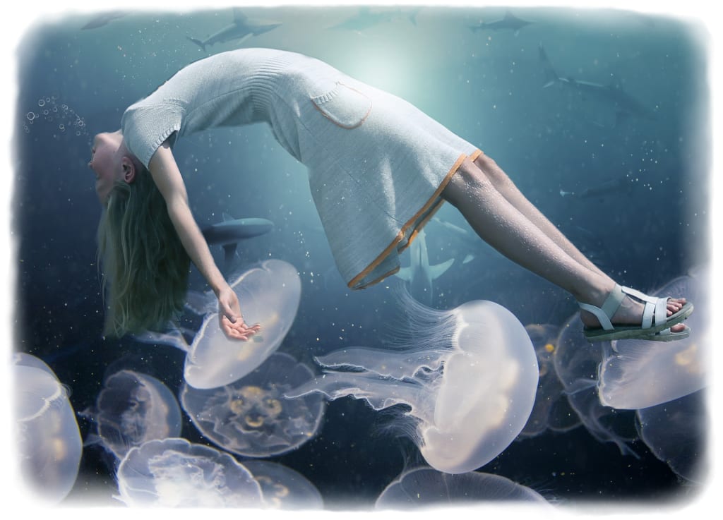 Filling her lungs near to bursting, she plunged herself underwater. She might escape the strange bubbles and rip tide by diving beneath them. The current pulled even harder, propelling her faster than if she wore long diving fins. Rushing water sounds seemed out of place in the sea’s tranquility. The shark swam beside her as if curious to see what she would do.
