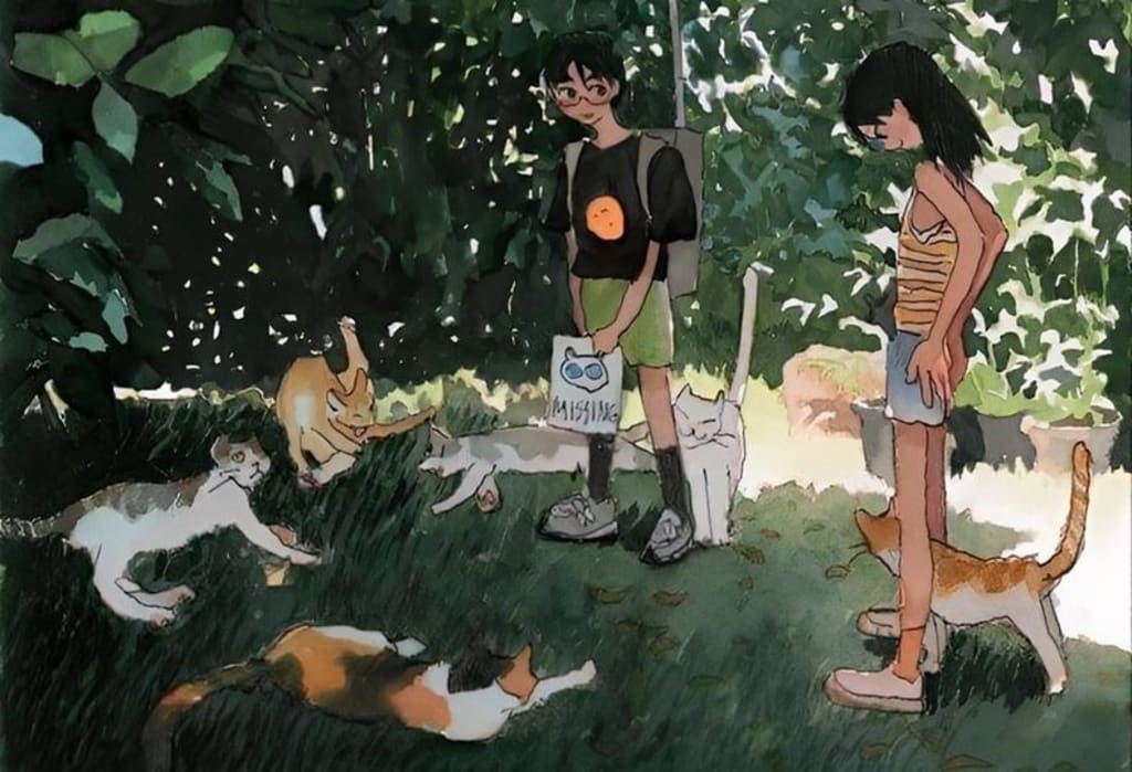 "Love can be found in the simplest of moments, like feeding cats on a quiet afternoon. It's the small acts of kindness and the shared passions that bring two hearts together, creating a bond that can last a lifetime." - by the story of the young boy and girl feeding cats.
