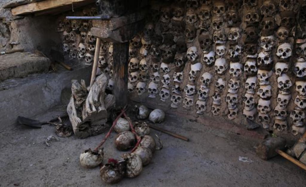 The white haired man kills the golden skull rolling out of the human head tower with one sword