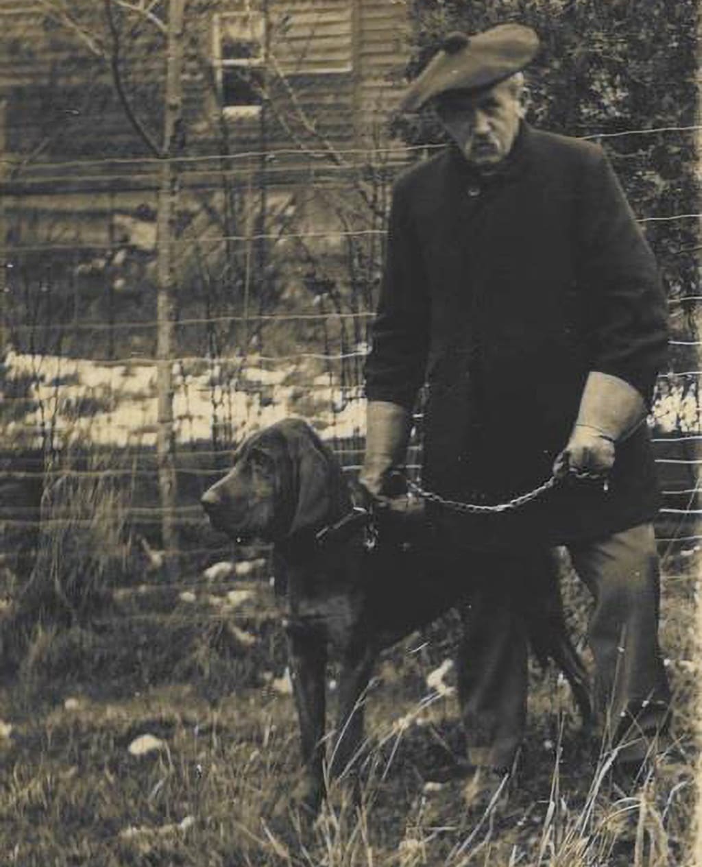 The next morning I arrived on the property at ten o’clock on the nose. It was a chilly March day, but Angus was waiting for me as expected, sporting a traditional tam-o’-shanter hat in keeping with his Scottish tradition. Standing loyally beside him on her leash was Esme, his world champion Coonhound. I introduced myself.