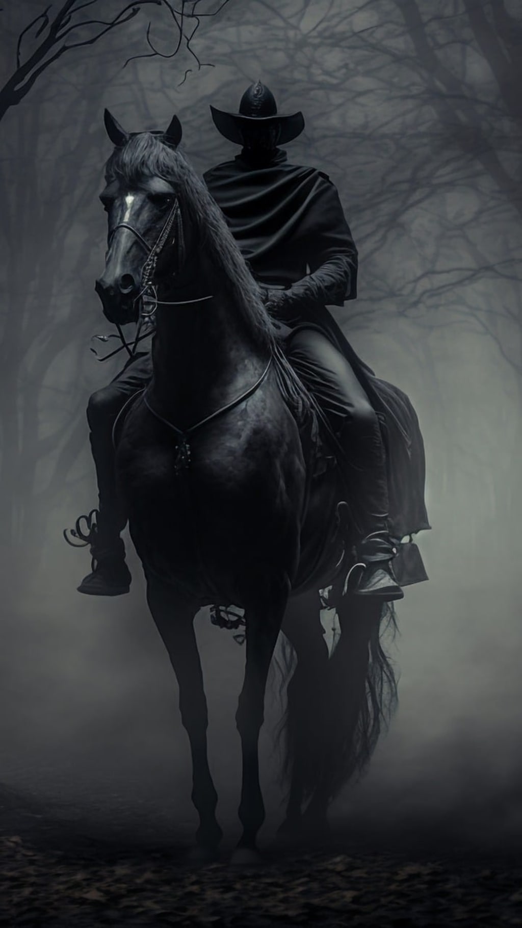 I see the shape of a man dressed all in black, wearing a black hat, riding a black horse with rutilant eyes bearing down on me.